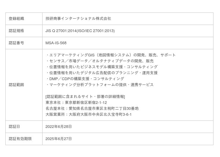 当社は、エリアマーケティング・商圏分析のDXツールや統計データ、位置情報等の3rd Partyデータ等の各種データを開発・販売している企業です。2013年よりプライバシーマークを取得しておりますが、個人情報のみならず、組織内の情報資産全般を保護し、外資系の企業を含むすべてのお客様・お取引先様により安心して当社サービスをご利用いただくために、ISMSの国際規格である「ISO 27001」認証を全社範囲にて取得する運びとなりました。