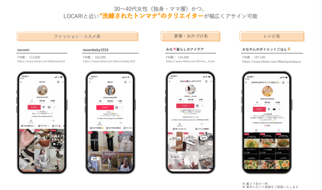 1.30-40代女性の美容/ファッション/ライフスタイルジャンルの投稿に強いTikTokクリエイター(https://lumos.co.jp/mate)が幅広くキャスティング可能