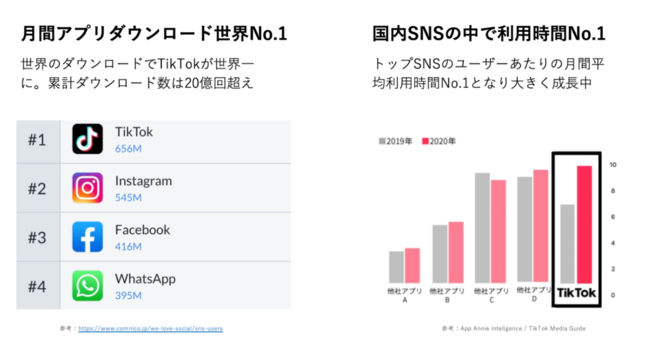 TikTokは月間アクティブユーザー数が国内で2,000万人(2021年8月時点)を突破し、年内にはFacebookを追い越す勢いで成長を続けるなど、強力なレコメンドシステムと縦型デバイスに最適化された視聴体験の提供により、全世界でユーザー数が急成長を重ねています。利用時間では2020年時点でTwitterやLINEを抜き、国内トップのSNSとなっています。