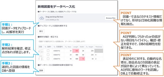 - 表記ゆれに対する、自動的な名寄せ。部品名などの図面の表記が設計者によって異なっていても、AIが同じ意味のワードを認識しDB上で自動修正する。
