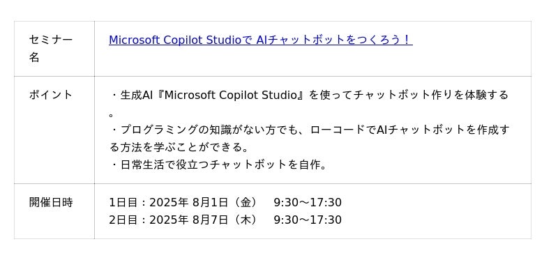 コムチュア株式会社コムチュア株式会社(本社:東京都品川区、代表取締役社長執行役員:澤田 千尋、以下「コムチュア」)のグループ会社であるエディフィストラーニング株式会社(本社:東京都中央区、代表取締役社長:亀井 貴裕、以下「エディフィストラーニング」)は、株式会社トモノカイ(本社:東京都渋谷区、代表取締役社長:徳岡臣紀)が主催する中高生向け探究コンテスト「自由すぎる研究(R)EXPO2025」の受賞者を対象に、生成AIセミナーを無償提供いたします。