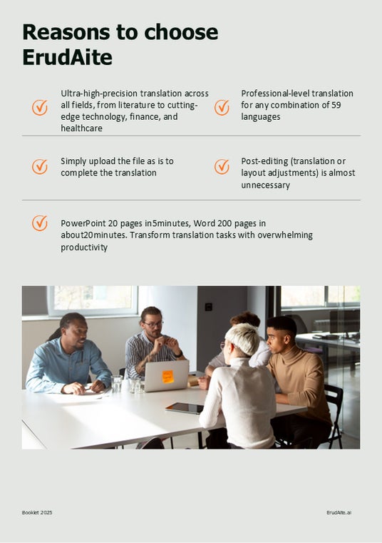 ErudAiteは、文書のレイアウトを理解し、意味的な情報を構造から読み解く独自AIエンジンにより、これらすべてを解決します。PDFレイアウトを完全保持し、WordやPowerPointとして編集可能な状態で出力。Excelの数式も保持したまま翻訳します。