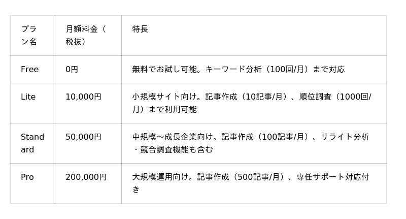 - 主な機能:記事構成案作成、リライト分析、新規キーワード発見、ページ診断、検索順位調査、競合調査 ほか