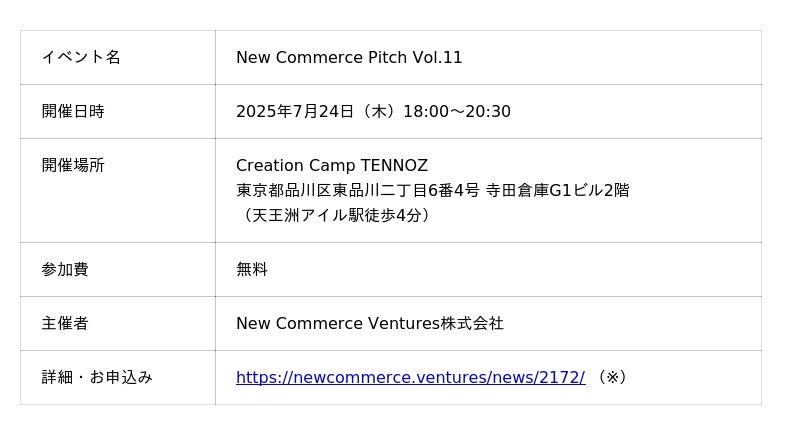 「New Commerce Pitch」は、New Commerce Ventures株式会社が主催する、コマース領域に特化したスタートアップのためのピッチイベントです。流通・小売・EC・D2C・リテールテックなどの分野で課題を解決するスタートアップ8社によるスタートアップピッチのほか、20社のスタートアップがブース出展を行い、参加企業とのネットワーキングの機会も提供されます。