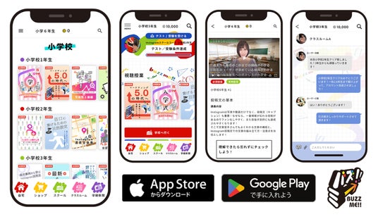 学校の世界観を舞台としているバズミー!!は、入会時は小学校1年生というランクからスタート。学年を上げるために、必須授業の視聴、選択式テストや講師からの添削など、ゲーム感覚で小学校~高等学校までの学年に応じた難易度のノウハウを習得することができます。