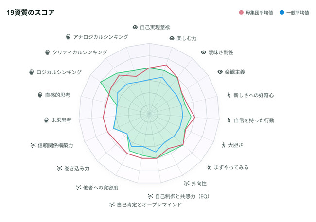 さらに、これら4つの能力のうち、変革人材として特徴的な19の資質を特定。77の質問に回答することで、これらの資質をどれだけ持ち合わせているかを可視化します。人が持っている思考や行動の特性に加え、多くのステークホルダーを巻き込む「関係性構築力」を資質として可視化していることが特徴です。