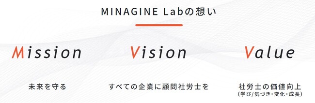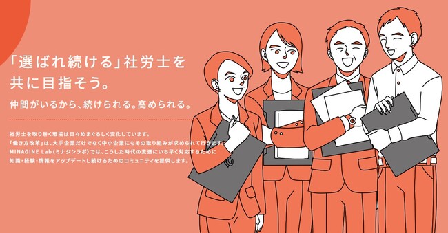 MINAGINE Lab(ミナジンラボ)は、「すべての企業に顧問社労士を」をビジョンに、社労士の価値向上を目的に設立された、株式会社ミナジンが運営する社労士専用のコミュニティサロンです。ミナジンラボでは、知識・経験・情報をアップデートすることで「顧問先と対等な関係」を目指す社労士の皆様に学びの場を提供します。