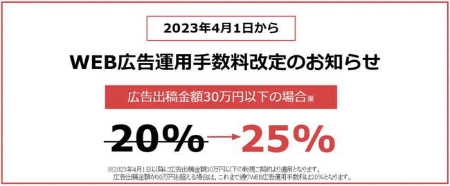 新規ご契約で広告出稿金額30万円以下の場合、WEB広告運用手数料を、従来の20%から一律25%に改定します。
