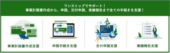 申請のための事業計画書の策定や必要書類の準備、申請のサポート、採択後の手続きや実績報告まで、ワンストップで支援を行います。