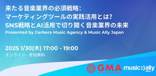 2025年1月30日(木)、数多くのレコード会社のSNS戦略を支援する、音楽業界専門のデジタルエージェンシー「Gerbera Music Agency」の協力のもと、Music Ally Japanは、デジタル戦略に積極的なレコード会社や企業が取り組んでいる「マーケティングツール活用」にフォーカスしたオンラインセミナーを無料配信します。