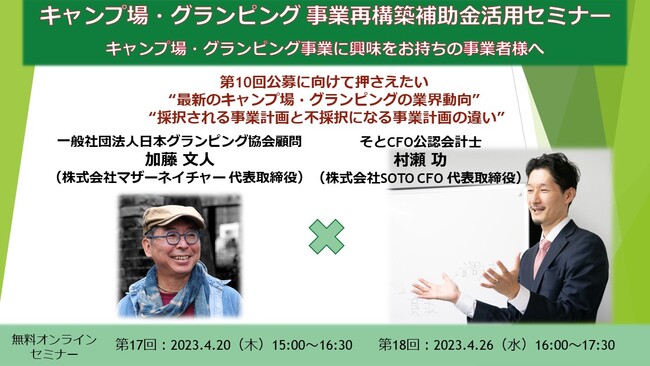 「事業再構築補助金を活用して新規事業としてキャンプ場・グランピング事業を提案する」無料のWebセミナー第17回・第18回を開催いたします。