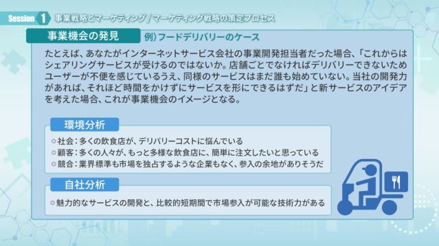 マーケティングは常に進化をしています。『売れる仕組みをつくる「マーケティング」』では、フードデリバリー等最新の具体的な事例を交えながらわかりやすく解説をしており、受講者は実際のビジネスシーンや市場状況に関する洞察を得ることができます。事例を豊富に用いている学習教材だからこそ、理論的な知識だけでなく、実践的な視点からの戦略立案や意思決定のスキルを向上させることができます。