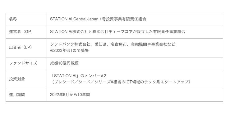 本ファンドは、STATION Ai株式会社と株式会社ディープコアが有限責任事業組合(LLP)を設立し、共同で無限責任組合員(GP)を担います。これまでにソフトバンク株式会社から3億円の出資を受けている他、金融機関や東海エリアの事業会社などからも出資を募り、総額10億円規模のファンドとなる予定です。