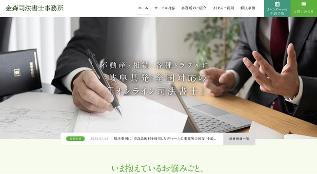 株式会社リーピー(本社:岐阜県岐阜市、代表取締役:川口聡)は、金森司法書士事務所(本社:岐阜県羽島郡、代表取締役:金森 耕治)のリブランディングのためのホームページを制作。画期的なオンライン相談システムや簡易予約システムの導入により、当地域では異例の新しいビジネススタイルを確立しました。このサイトの公開により、全国からの相談者の依頼に対応可能となります。
