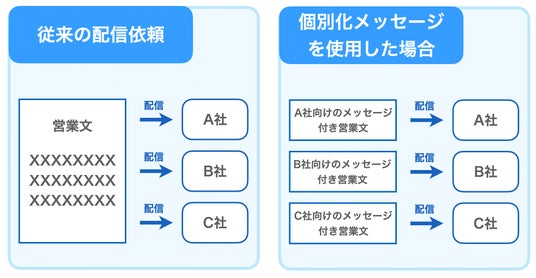 「個別化メッセージ」では、ダウンロードされた営業リストに記載されている【企業特色】と、配信先企業に【提案する内容】を結びつけて、
