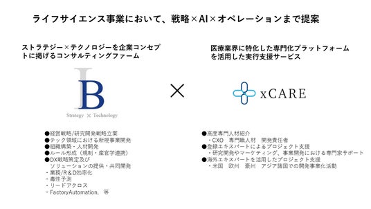 医療業界特化型エキスパートプラットフォームを運用するスタートアップ企業、株式会社xCARE(本社:東京都渋谷区、代表取締役 福永将)はこの度、企業経営支援とテクノロジー開発(ストラテジー×テクノロジー)に強みを持つコンサルティングファームである株式会社イノベーターズ・ブレイン(本社:東京都渋谷区、代表取締役 伊藤 慎司)と業務提携を締結しました。本提携により、両社はライフサイエンス企業向けに優位性を生み出す戦略立案から実行支援まで一貫したサービスを提供し、顧客の経営活動を高度化し、革新的創薬の加速をサポート致します。
