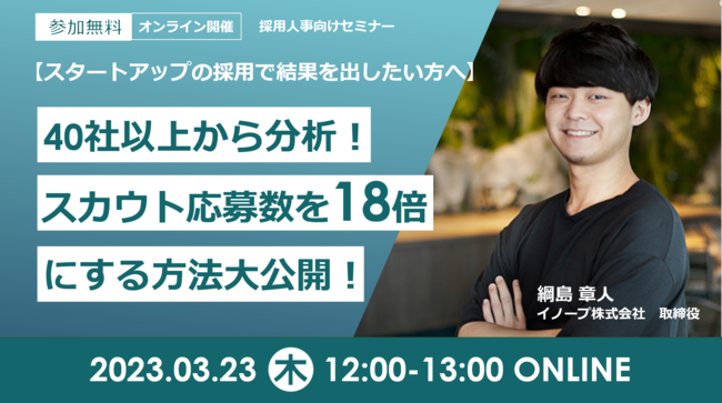 イノープ株式会社(本社:東京都渋谷区、代表取締役:佐多研人)は、3月23日に採用人事向けのウェビナー『【スタートアップの採用で成果出したい方へ】40社以上から分析!スカウト応募数を18倍にする方法を公開する採用人事向けセミナー』を開催いたします。オンライン開催で参加費無料、当日の参加も可能です。