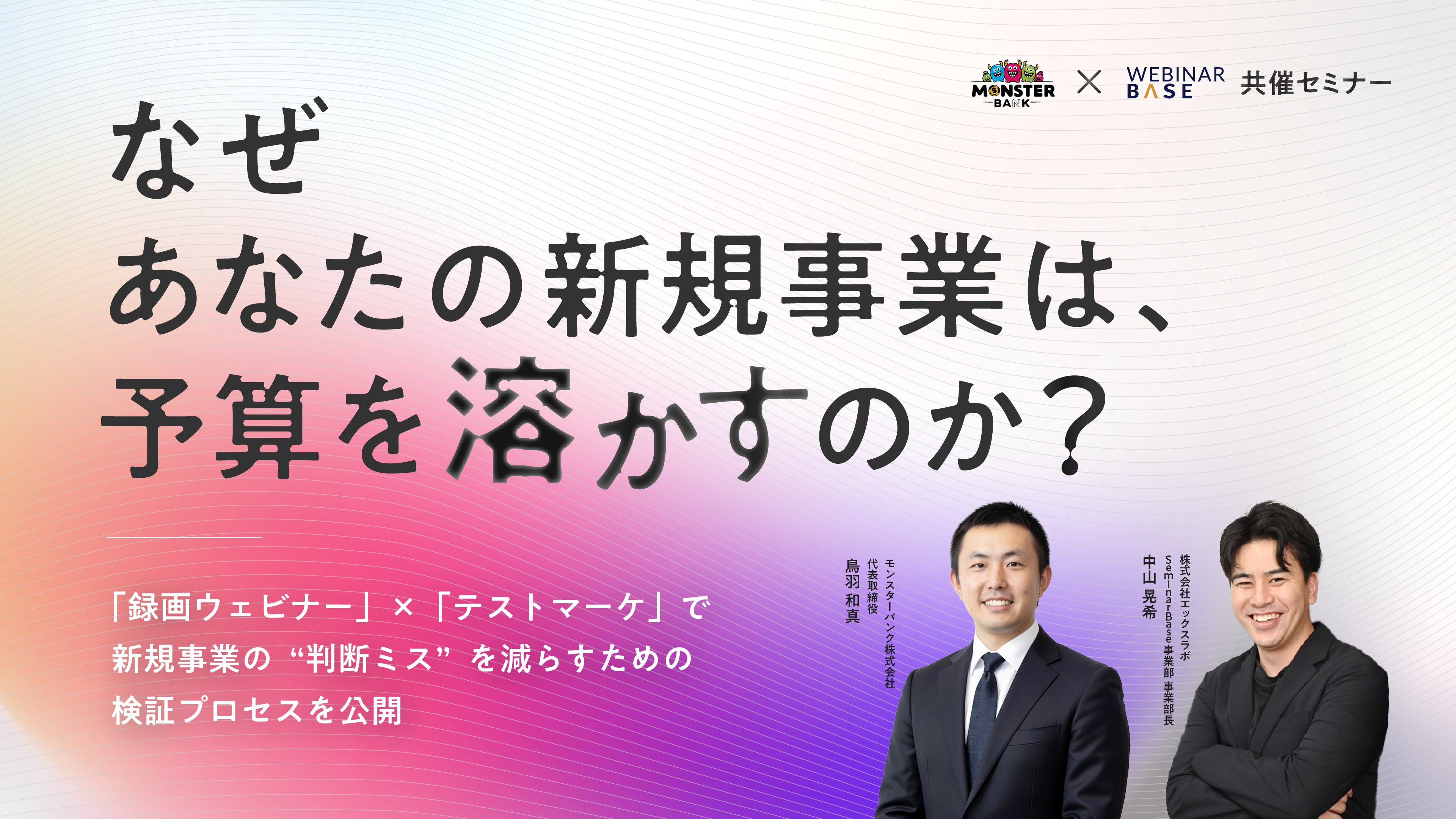 本ウェビナーでは、「なぜ新規事業は、成果が出ないまま予算だけが消えていくのか」という問いを起点に、施策の良し悪しではなく、「続けるか・止めるか」をどう判断するかという視点から、録画ウェビナーとテストマーケティングを組み合わせた検証の考え方を対談形式でお伝えいたします。