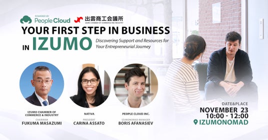 また、出雲市内の外国人で起業に関心のある人を対象とした説明会を、People Cloudと出雲商工会議所との共同で、コワーキングスペースIzumonomadにて、2024年11月23日に開催します。本イベントでは、出雲商工会議所の紹介をはじめ、出雲市内で起業している外国人の方のお話や、一般的に外国人の方が起業する場合の注意点などを説明します。ゲストには、ブラジル人に対して通訳翻訳・言語教育・経営コンサルティングを行う、Nativa代表のアサト・カリナ氏を迎え、外国人の創業に関して実体験をもとに参加者にアドバイスすると共に、イベント全般のポルトガル語への通訳を行います。