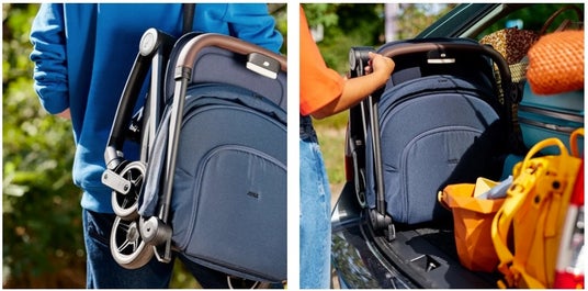 折りたたんだベビーカーは、車のトランクや家の玄関スペースにもスマートに収まるコンパクトサイズに。折りたたんでしっかり自立します。