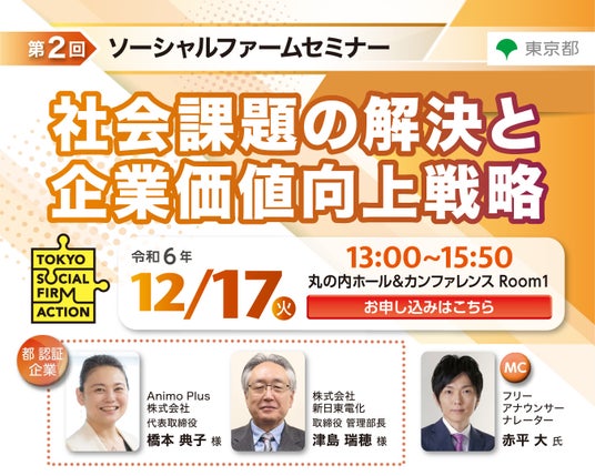 本セミナーでは、東京都が認証したソーシャルファーム企業の経営者が自社の事例から得た、障がいのある方・引きこもり経験がある方・ひとり親・刑余者などで、さまざまな理由から働くことに困難を抱えている方の雇用・定着、働きやすい環境の整備の他、経営課題の解決や自律的経営の実現といったノウハウをご紹介します。