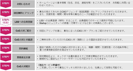 本サービスは、LSSの独自のナレッジ・コネクションを活用し、スタートアップ企業の更なる成長に向け、CXO人材によるアドバイザリー・デリバリー支援を目的としております。