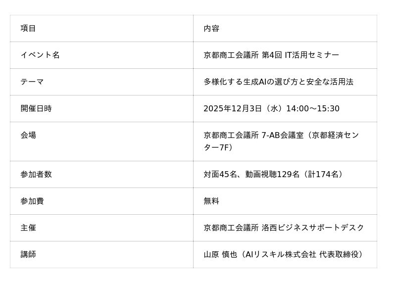 AIリスキル株式会社(本社:大阪市北区、代表取締役:山原慎也)は、法人向け生成AI研修サービスの本格提供に向けて準備を進めています。本リリースでは、その第一弾として2025年12月に京都商工会議所で開催した生成AIセミナーの成果を報告します。同セミナーには対面45名・動画視聴129名の計174名が参加し、5段階評価のアンケートでは「不満」の回答がゼロ、全体の93%が「満足」と回答しました。