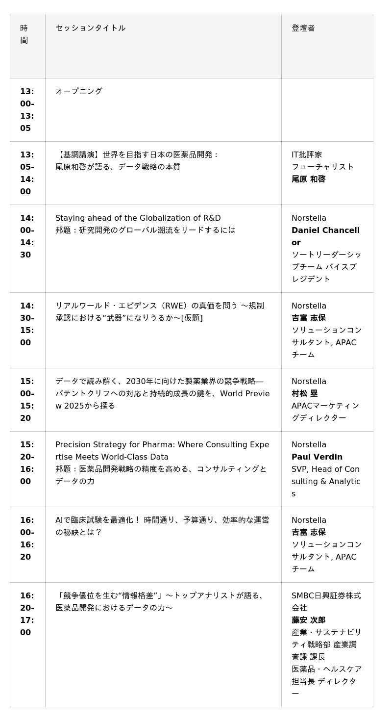 本イベントでは、医薬品開発の全ステージにおける意思決定を支える“インテリジェンス”の力に焦点を当て、業界の第一線で活躍する識者による講演を通じて、グローバル展開、臨床試験設計、競合分析、商業化戦略など、製薬企業が直面する課題への解決策を提示します。