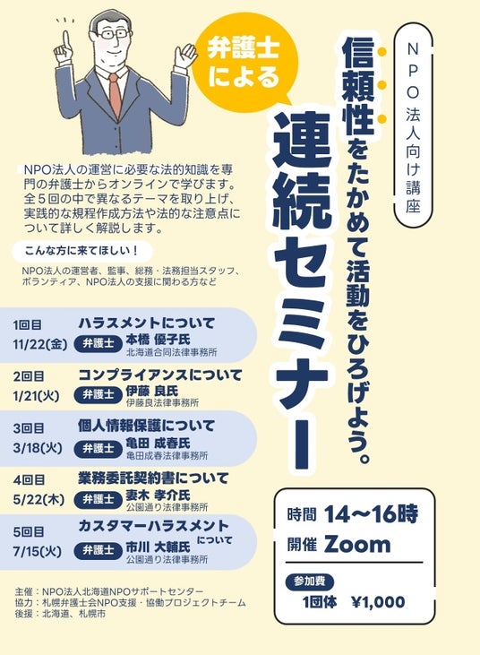 信頼性を高めてNPO活動を広げよう!弁護士による連続セミナー -NPO法人北海道NPOサポートセンター主催、2024年11月から2025年7月にわたり開催します