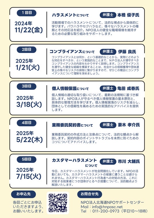 北海道NPOサポートセンター信頼性を高めてNPO活動を広げよう!弁護士による連続セミナー -NPO法人北海道NPOサポートセンター主催、2024年11月から2025年7月にわたり開催します