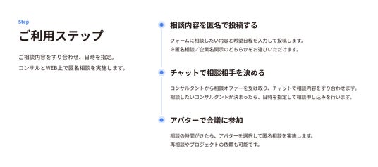 会社名や氏名、顔を明かさずに相談できるため、直接は話しにくい課題についても安心して議論できます。会話は全て秘密保持の対象となるため、NDA不要でクイックに相談できます。オンライン上で相談内容を投稿すると、経験豊富なコンサルタントからオファーが届き、最短1営業日でマッチングします。事前にチャットで相談内容をすり合わせられるため、「話してみたら違った」というリスクも避けられます。(企業名を開示して相談することも可能です)