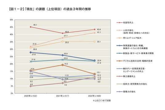 一般社団法人日本能率協会『日本企業の経営課題2022』によると、人材採用・人材育成を「現在の経営課題」に挙げる企業は41.1%でした。「3年後の経営課題」に挙げる企業も41.7%と多く、人材問題が継続的な懸念材料となっていることが分かります。