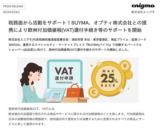 BUYMA社との業務提携ブランド品などのC2Cマーケットを手掛けるBUYMA社と提携し、ブランド品購入時のVAT還付についてのアドバイスや税還付を対応することになりました。(2023年8月)