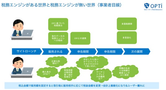 また一般的に税務エンジン導入にはかなりの時間と費用が掛かります。オプティでは、世界での越境ECに勝機を見出そうとしているお客様の要望に応じて、リーズナブルな価格でのツールの選定と導入支援、複数国での税務対応を行っていきます。
