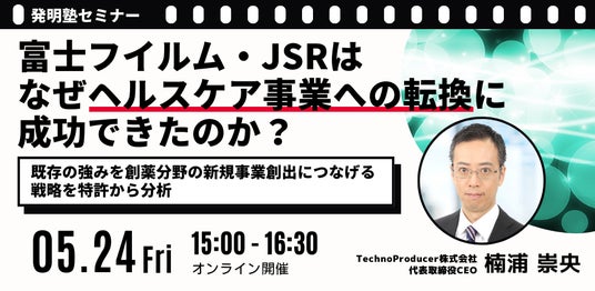 TechnoProducer(テクノプロデューサー)株式会社(代表取締役:楠浦崇央)は、2024年5月24日(金)15時から「発明塾セミナー:富士フイルム・JSRはなぜヘルスケア事業への転換に成功できたのか? ~既存の強みを創薬分野の新規事業創出につなげる戦略を特許から分析」を開催致します。