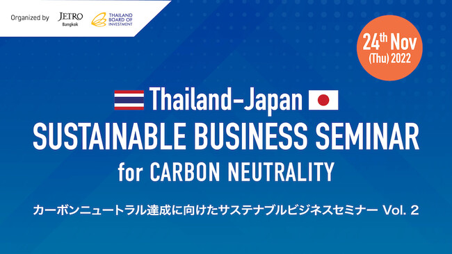 日本貿易振興機構(JETRO)バンコク事務所は、タイ投資委員会(BOI)と11月24日(木)に「カーボンニュートラル達成に向けたサステナブルビジネスセミナー」をオンラインにて開催します。MEDIATOR CO., LTD.(本社:タイ王国バンコク、代表取締役社長:ガンタトーン・ワンナワス)は、JETROより本事業を受託し、運営事務局を務めています。
