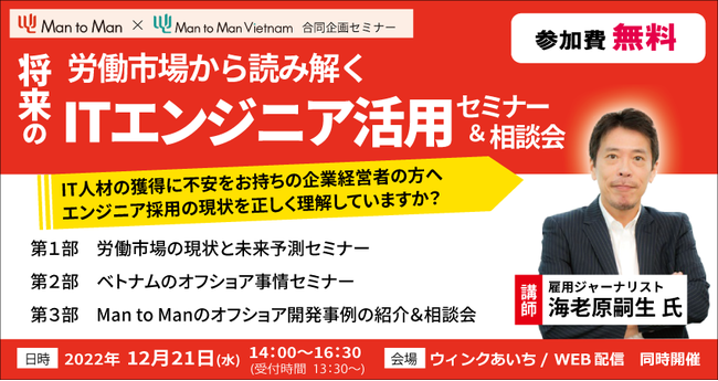 総合人材サービス事業を展開する Man to Man 株式会社(本社:愛知県名古屋市 取締役社長:手島雄一 以下、当社)は、2022 年12月21日に労働市場から読み解く3年後の人材確保に役立つITエンジニア採用セミナーを開催いたします。