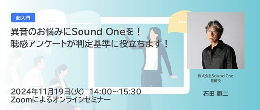 「株式会社Sound One(サウンド ワン)」(代表取締役社長:後藤泰宏)は、2024年11月19日(火)にオンラインセミナー「異音のお悩みにSound Oneを!聴感アンケートが判定基準に役立ちます!」を開催します。