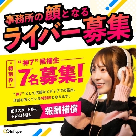 事務所創業記念キャンペーン“神7メンバー募集”を開始。7名限定でサポートが更に充実Infique設立を記念して「事務所創業記念キャンペーン」を開始致しました。初期の7名のライバーを対象に、さらに充実したサポートを提供します。詳しくはInfique公式サイトをご確認ください。