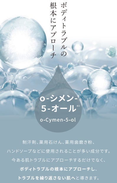他にもボディトラブルの根本にアプローチするo-シメン-5-オール(※4)、カキタニン(※5)、最旬成分であるナイアシンアミド(※6)、パンテノール(※7)もプラスしました。