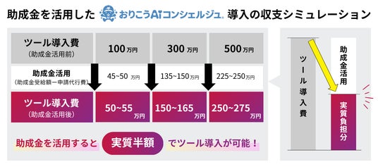 生成AIを使った接客型MAツール「おりこうAIコンシェルジュ」を提供するディーエスブランドと、助成金申請支援を行うTRIPORTが連携することで、「業務改善助成金」の活用がスムーズに行えるようになり、企業は実質的に約半額の負担でツールを導入できるようになります(下図)。