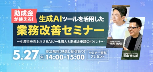 TRIPORTは、ディーエスブランドが主催するセミナー「助成金が使える! 生成AIツールを活用した業務効率化セミナー ~生産性を向上させるAIツール導入と助成金申請のポイント~」(2025年5月27日(火)開催)に登壇します。