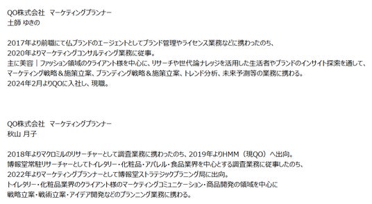 お問い合わせフォーム【ご参考】公式noteで「生活者見立て通信 編集部こぼれ話」を発信中QO公式noteでは、生活者見立て通信の執筆にあたってのこぼれ話をご紹介しています。QOのプランナーがめぐらせた思考過程や苦労したこと、「見立て」をつくるコツなどざっくばらんにお届けしています。あわせてご覧いただけましたら幸いです。