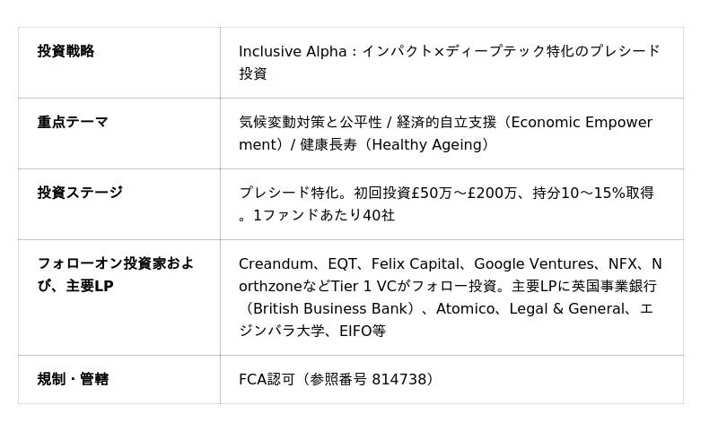 Ada Venturesは、英国・アイルランド・北欧のテック企業への投資に特化し、気候変動対策・経済的自立支援・健康長寿の3テーマにおけるインパクト投資を軸とする、英国最大級のプレシードVCです。