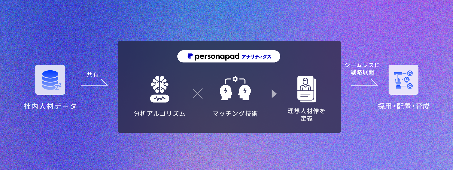 運用まで見据えた分析:分析から導かれたペルソナ像を、採用から新入社員の配属、育成、評価制度の設計まで、具体的な人事施策へ落とし込みます。 施策の実行を通じて、エンゲージメント向上と人的資本経営の実現を支援します。必要に応じて AIスカウト / AI書類選考 / AI面接などPersonapad各サービスへの接続も可能です。