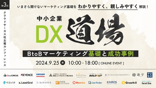 売上アップを仕組みで実現するCRM「Kairos3(カイロススリー)」を提供するカイロスマーケティング株式会社(本社:東京都渋谷区、代表取締役:佐宗 大介、以下「当社」)は、クラウドサーカス株式会社が主催する「中小企業DX道場 ~BtoBマーケティング基礎と成功事例~」に9月25日(水)に登壇いたします。