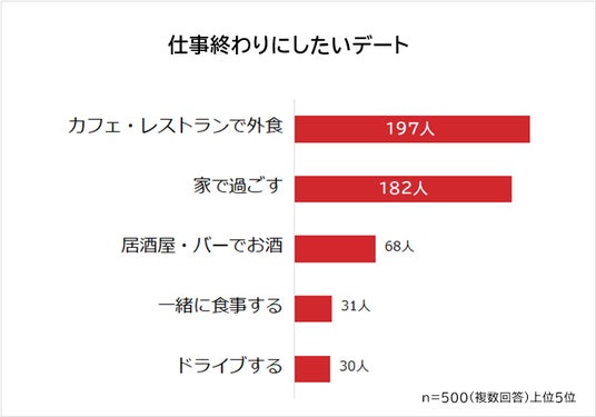 https://r-andg.jp/ )は、20代~40代の社会人500人に「仕事終わりのデート」についてアンケート調査を実施。その結果をランキング形式でまとめました。