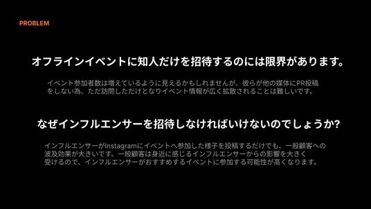 せっかく費用をかけてイベントやPOPUPを開催しても、イベント情報が拡散されなければ元も子もありません。また、なるべく多くの潜在顧客へイベント内容を伝えなければなりません。そのためにインフルエンサーの招待が必要となります。