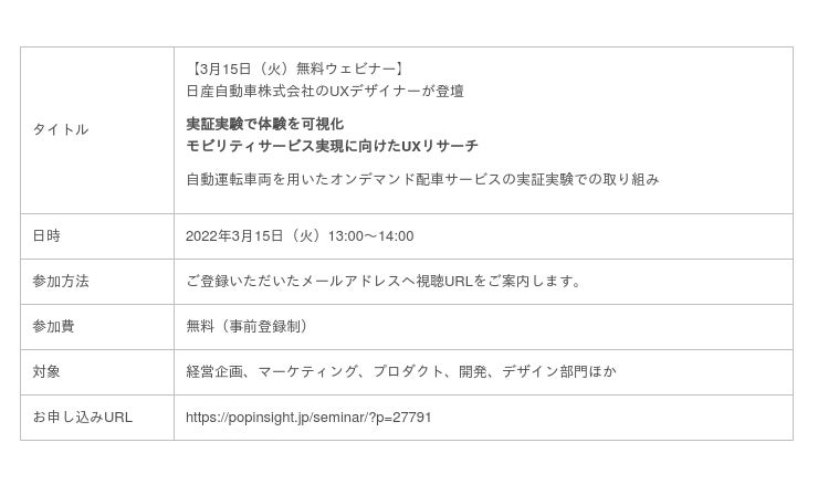 本セミナーでは、日産自動車株式会社のUXデザイナー 高岡 香那さんがご登壇。2021年秋に実施された「自動運転車両※2を用いたオンデマンド配車サービスの実証実験」ではUXリサーチが導入され、ポップインサイトも高岡さんのチームに伴走しご支援いたしました。 高岡さんには、どのような調査設計でリアルタイムの乗車体験を可視化したのか、そこから得た学びやチームでの取り組みについてお話しいただきます。大規模な実証実験におけるUXリサーチ事例を知ることができる貴重な機会です。ぜひご参加ください。※1「Easy Ride」は株式会社ディー・エヌ・エーと日産自動車株式会社の登録商標です