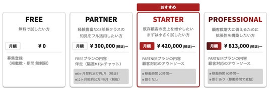 SuccessBoxでは、フリープランからプロフェッショナルプランまで4つのプランをご用意。ニーズに応じて最適なプランを柔軟に選ぶことができます。(有償プランは月額料金+CS人材の稼働時間に応じた料金の合計となります)。